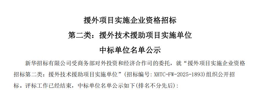 2025年12月底,商务部援外项目实施企业资格招标(第二类:援外技术援助项目实施单位)结果公示。中地海外农业发展有限公司凭借深厚的专业技术实力,以及良好的行业口碑,获得援外项目实施企业资格。