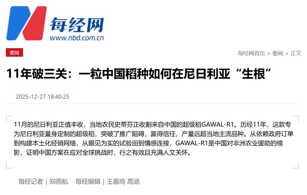 12月27日,《每日经济新闻》刊登文章《11年破三关:一粒中国稻种如何在尼日利亚“生根”》。每经网对中地海外绿色农业西非有限公司扎根尼日利亚,开展超级稻种育种项目进行深入报道,指出公司专为尼日利亚量身定制的超级稻GAWAL-R1突破了推广阻碍,赢得当地信任,产量远超当地主流品种,成为中国对非洲农业援助的缩影。