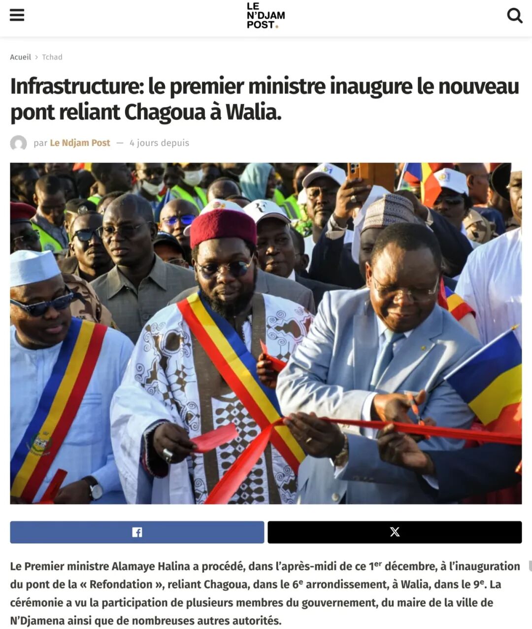 当地时间2025年12月1日,中地海外乍得公司承建的乍得首都恩贾梅纳夏瓜大桥竣工典礼在沙里河畔隆重举行。